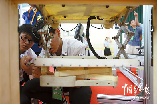 7月26日,2014“挑战杯”全国职业学校创新创效创业大赛在浙江杭州开幕,参赛选手在调试参赛作品。本报记者 赵迪摄