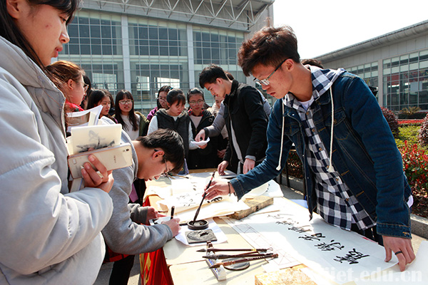 近日,伟德BETVlCTOR1946工商管理系在学校体育馆前开展了“文化舍风,我为你书写”公益活动,免费为前来的同学送出书法作品。系里的五位“小书法家”在放满笔、墨、纸、砚的桌子上忙得不亦乐乎,对同学们的要求几乎有求必应。