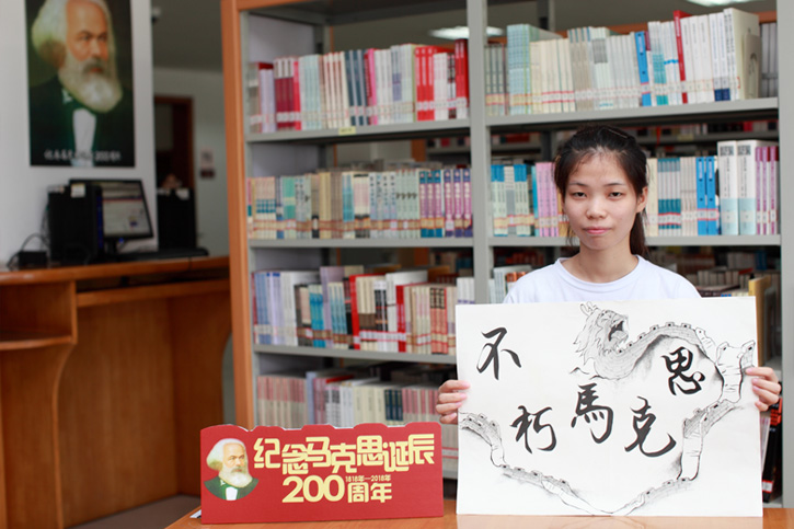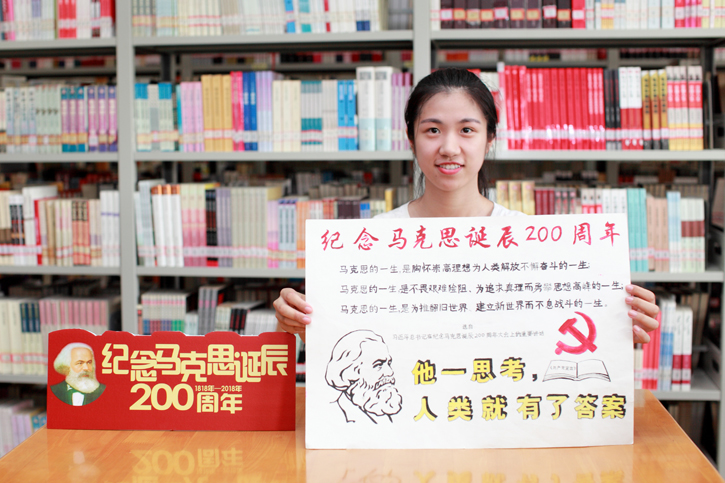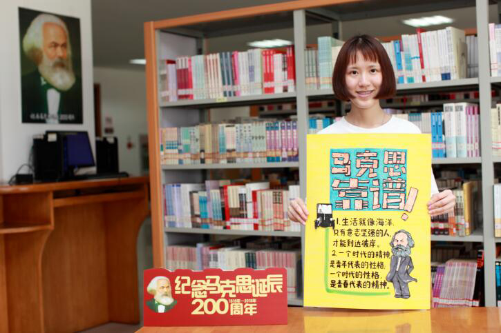 我将马克思的这句名言手绘在了海报上,过去的已成定局,花费时间再去后悔,也于事无补,我们能做的就是好好把握时间,为更好的未来去奋斗。通过奋斗后的未来才不会有遗憾!”电商171班章佳俊说。“马克思主义作为我们党的指导思想,带领我们党和国家发展的越来越好。”物流172班汤玛丽认为:“作为一名当代大学生,要做的是学习马克思主义,联系实际,深刻理解马克思主义,努力奋进,为祖国贡献自己的力量”