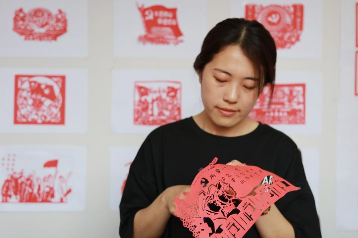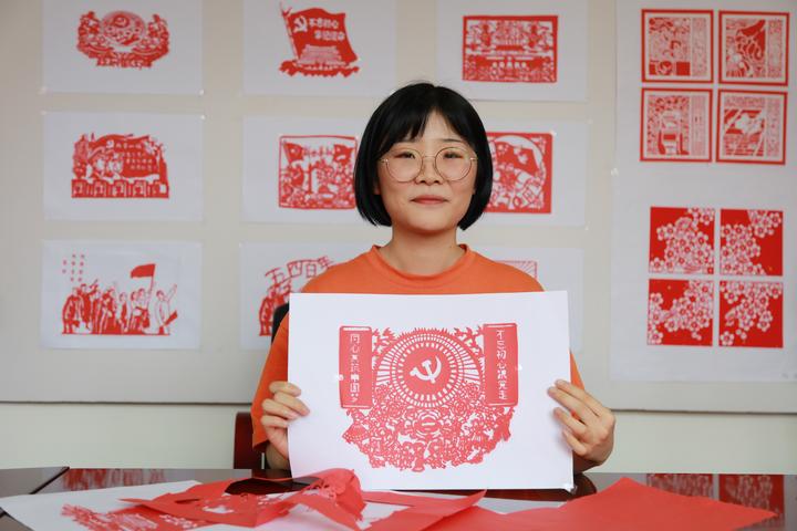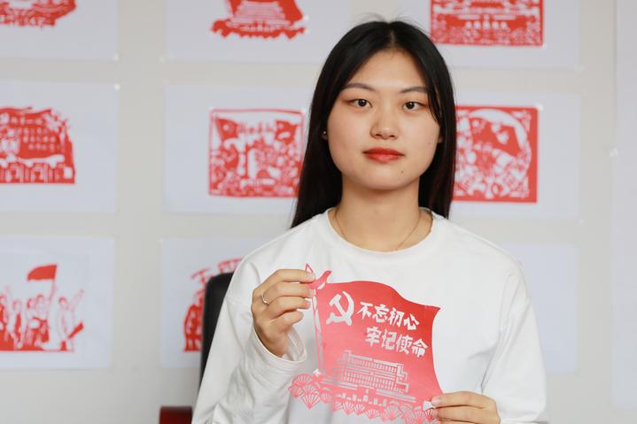 “我的剪纸主题是‘不忘初心 牢记使命’,中间是一面鲜红的党旗,其中还有天安门广场,以及若干扇子,象征着我们要不忘初心,牢记使命,高举中国特色社会主义道路伟大旗帜,为共产主义奋斗终身。”计算机171班的赵心月说,少年心事当拏云,通过这次活动,她收获很多,用剪纸作品祝福祖国的方式也很特别。