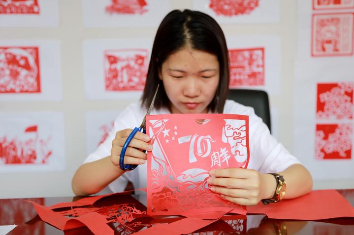 “这幅纪念新中国成立70周年的剪纸,我花了快两小时构图,连续剪了三个小时,剪到眼痛手麻,还磨破了皮,但看到成品之后,满满喜悦和自豪。” 会展172班的徐懿向记者展示了自己的作品, 觉得这真是一次美好的体验。