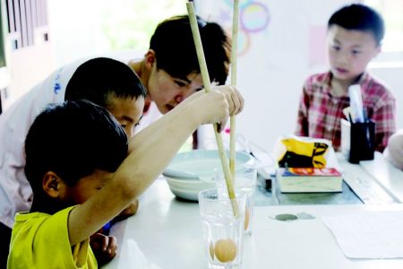 今年,支教队员们围绕“庆祝建国70周年 弘扬爱国主义精神”主题,结合当地实际,精心开设了特色鲜明的支教课程,包括爱国主义教育、安全教育、国际文化与中国传统文化讲座、垃圾分类知识宣讲、心理健康讲座、手工书法绘画舞蹈、趣味科学数学、暑假作业辅导等,内容比往年更丰富、全面,深受小朋友们的欢迎。“大家知道吗?一个小小的电池就会污染一立方米的土壤,让土壤永远失去利用价值。大家是否知道,‘垃圾围城’成为全球趋势……”课堂上,支教大学生曹圆圆通过一张张触目惊心的照片和一段段视频告诉小朋友,垃圾污染已严重影响了我们的生活,做好垃圾分类迫在眉睫。除了课堂教学,支教大学生还组织开展“给垃圾找个家”“分类卡片”“精准投射”等系列趣味活动,在寓教于乐中提高小朋友们的垃圾分类能力。