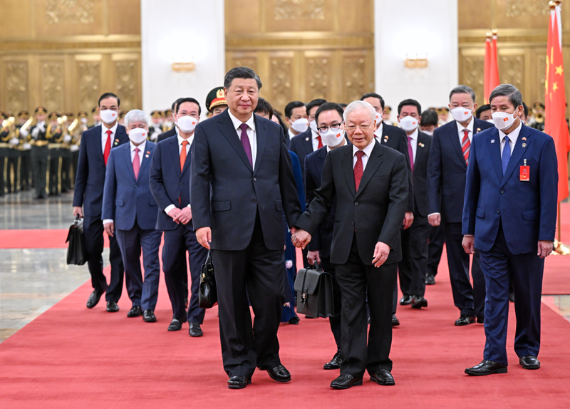10月31日,中共中央总书记、国家主席习近平在北京人民大会堂同越共中央总书记阮富仲举行会谈。双方一致表示,要秉持“十六字”方针和“四好”精神,巩固传统友谊、加强战略沟通、增进政治互信、妥善管控分歧,推动新时代中越全面战略合作伙伴关系不断迈上新台阶。