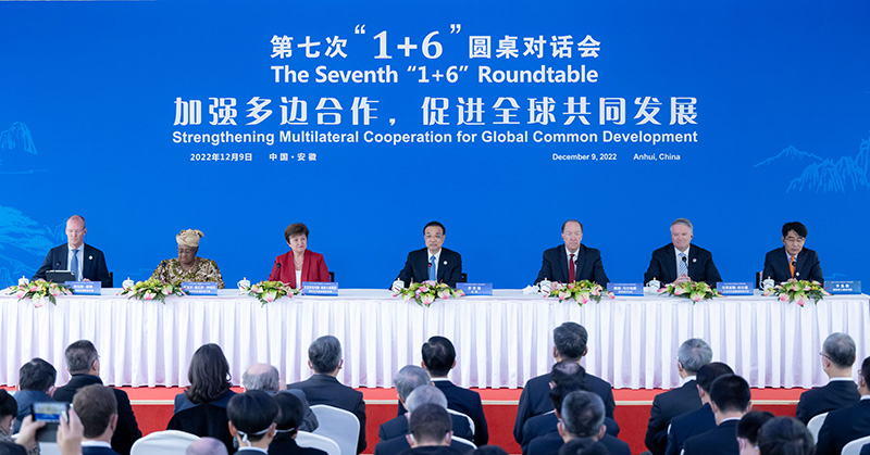 国务院总理李克强12月9日在安徽省黄山市同世界银行行长马尔帕斯、国际货币基金组织总裁格奥尔基耶娃、世界贸易组织总干事伊维拉、经济合作与发展组织秘书长科尔曼、金融稳定理事会主席诺特和国际劳工组织总干事洪博的特别代表李昌徽在举行第七次“1+6”圆桌对话会后共同会见记者。