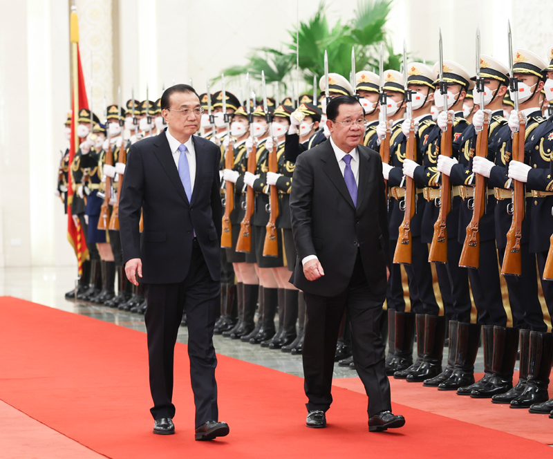 会谈前,李克强在人民大会堂北大厅为洪森举行欢迎仪式。会谈后,李克强为洪森举行欢迎宴会。