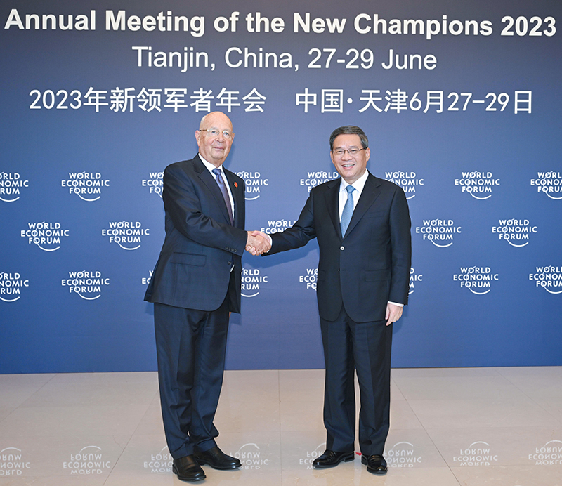 国务院总理李强6月26日下午在天津会见世界经济论坛主席施瓦布。