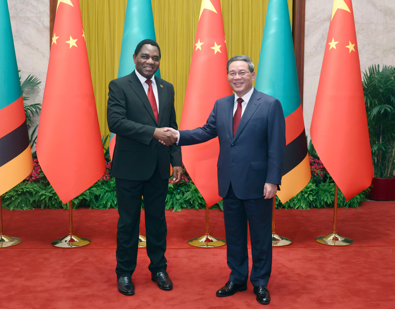 9月15日下午,国务院总理李强在北京人民大会堂会见来华进行国事访问的赞比亚总统希奇莱马。新华社记者 刘卫兵 摄