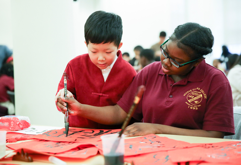 2018年2月2日,在美国纽约举行的文化交流活动上,来自北京的小学生教纽约梅德加・埃弗斯学院预备学校的学生练习中国书法。新华社记者 王迎 摄
