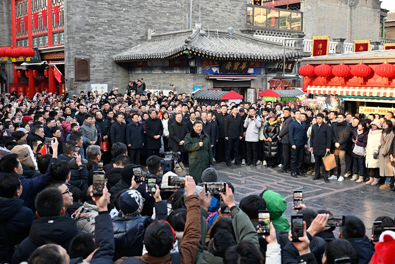 当天下午,习近平来到天津古文化街。街道古色古香,习近平沿街步行,先后走进桂发祥十八街麻花、果仁张、泥人张、杨柳青年画等特色店铺,了解产品种类、销售和传统文化传承发展等情况,同店铺业主、员工和现场群众互动交流。他说,各级党委和政府要加强节日期间民生商品的产销保供,确保数量充足、品类丰富、质量可靠,让广大群众放心消费、快乐过年。习近平指出,中国式现代化离不开优秀传统文化的继承和弘扬,天津是一座很有特色和韵味的城市,要保护和利用好历史文化街区,使其在现代化大都市建设中绽放异彩。