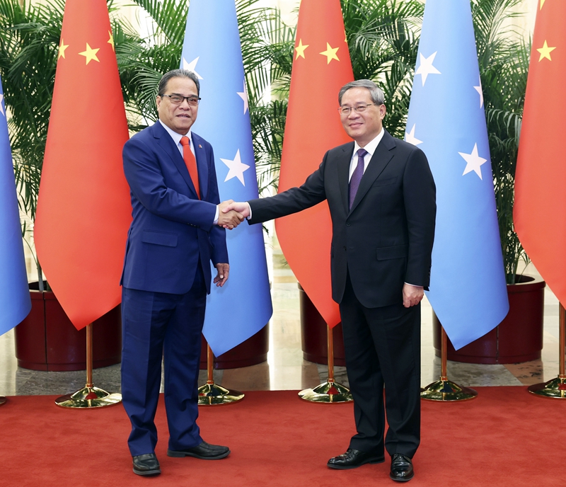 李强表示,中国同密克罗尼西亚联邦建交35年来,两国关系取得长足发展,中密友好历久弥坚,合作成果丰硕。昨天,习近平主席同总统先生举行会谈,共同擘画了两国关系发展新蓝图。中方愿同密方一道,以两国元首重要共识为战略引领,发扬传统友好,深化政治互信,拓展互利合作,推动中密全面战略伙伴关系不断走深走实,更好惠及两国人民。