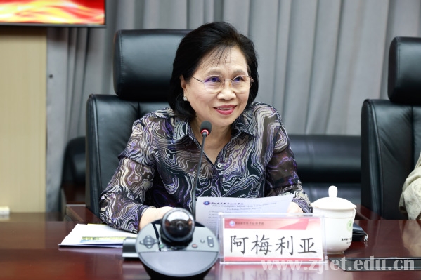 阿梅利亚·A·比格莱特对学校的热情接待表示感谢,简要介绍了菲律宾南方大学的基本情况、特色专业设置。她表示,学校特色专业的实训教学体系与人才培养经验具有重要借鉴意义,期待与我校建立长期稳定的合作关系,携手培养符合区域发展需求的高素质数字技能人才。